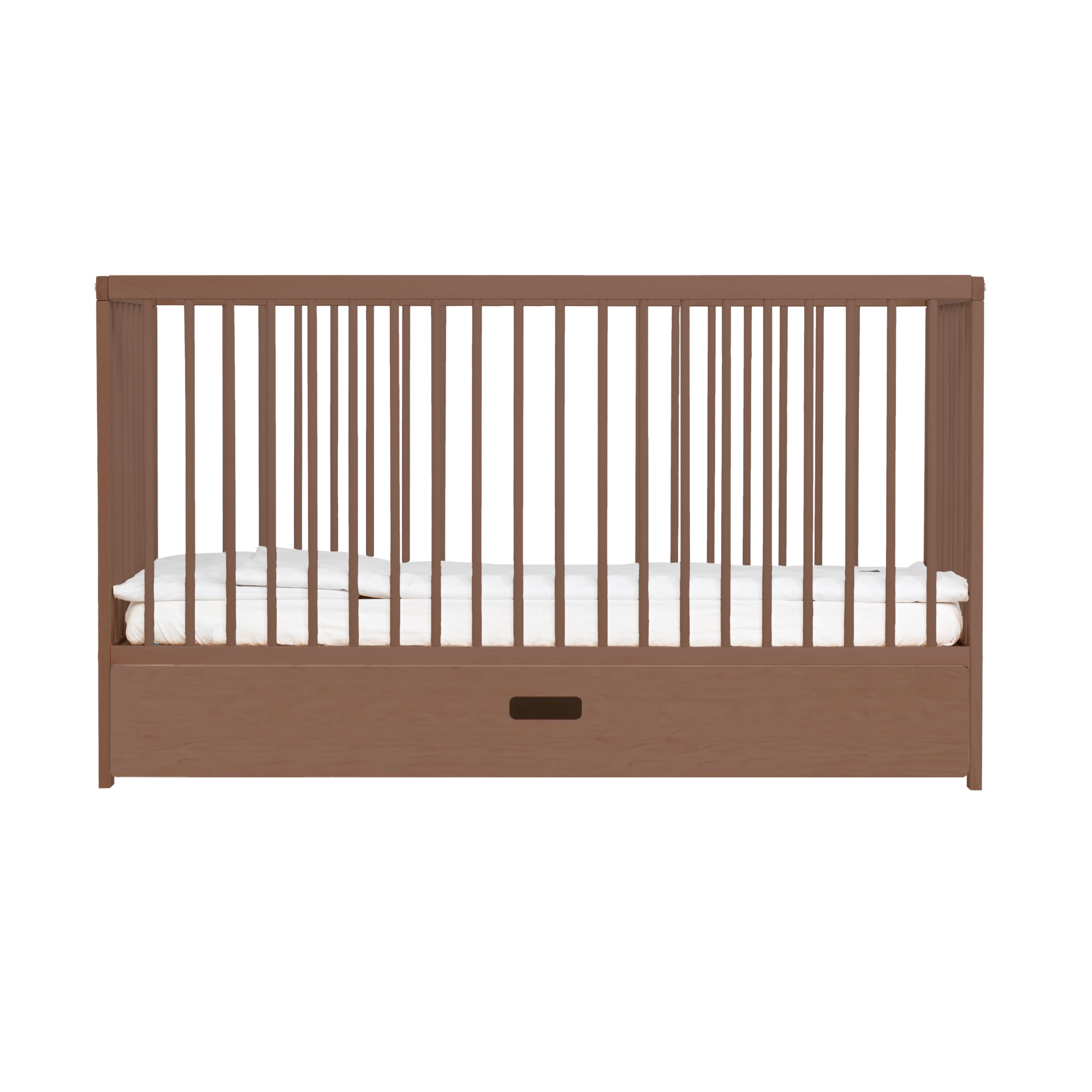 This award-winning cot bed is crafted in Europe from FSC-certified solid beechwood for long-lasting quality. Finished with a walnut stain for a vintage inspired cot.