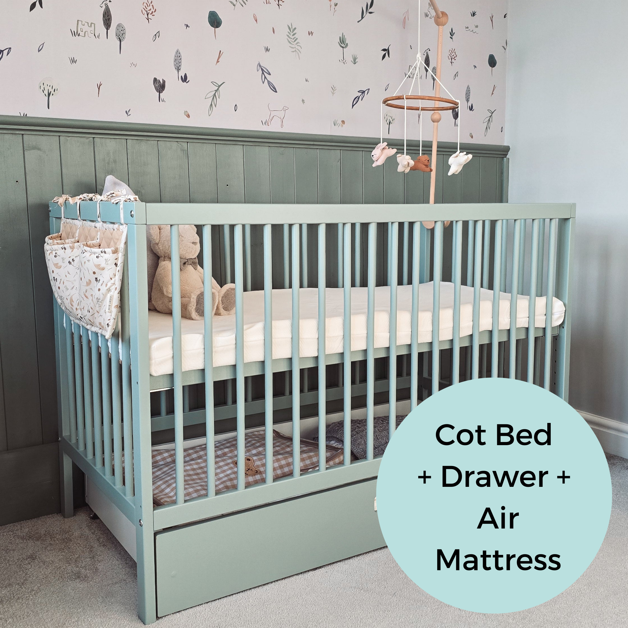 Midi Cot Bed With Drawer & Luxury Breathable Air Mattress - Stone Teal
