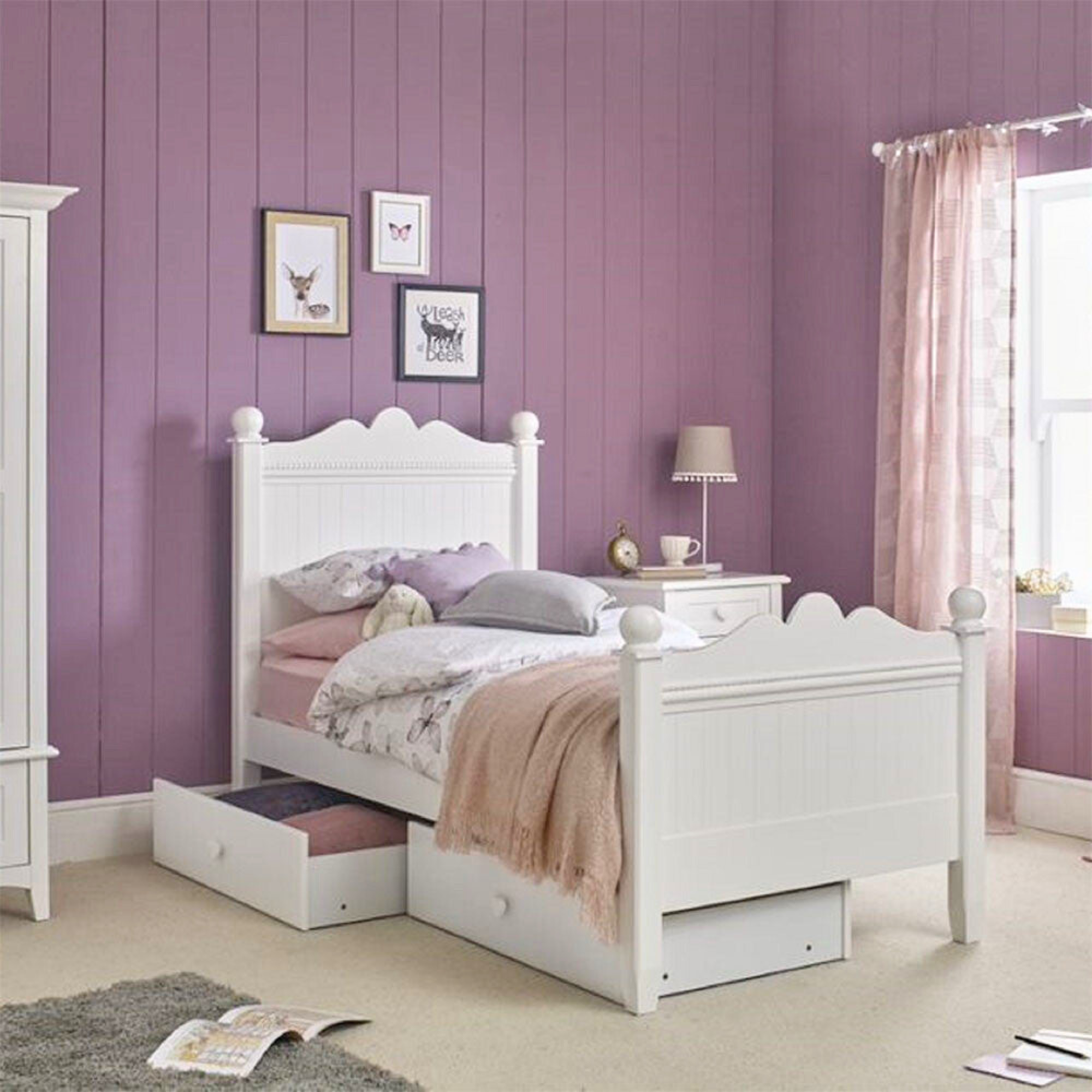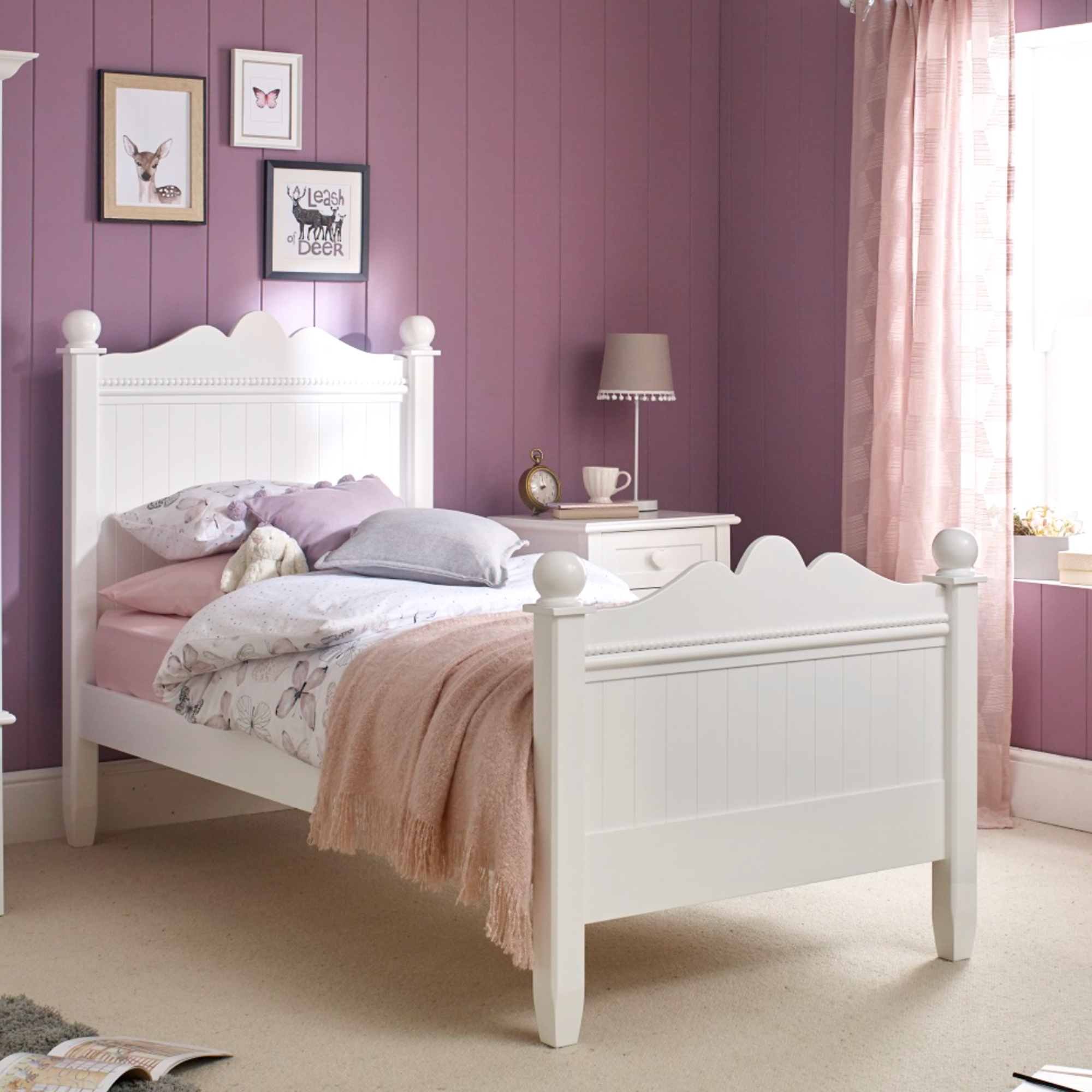 The stunning Princess single bed is an instant centerpiece, from its enchanting curved headboard design to the exquisite beading detailing. Built to last from sustainably-sourced solid wood, this "kid tough" bed features reinforced slats and a protective multi-layered white paint finish that stands up to years of scuffs, knocks, and adventures.