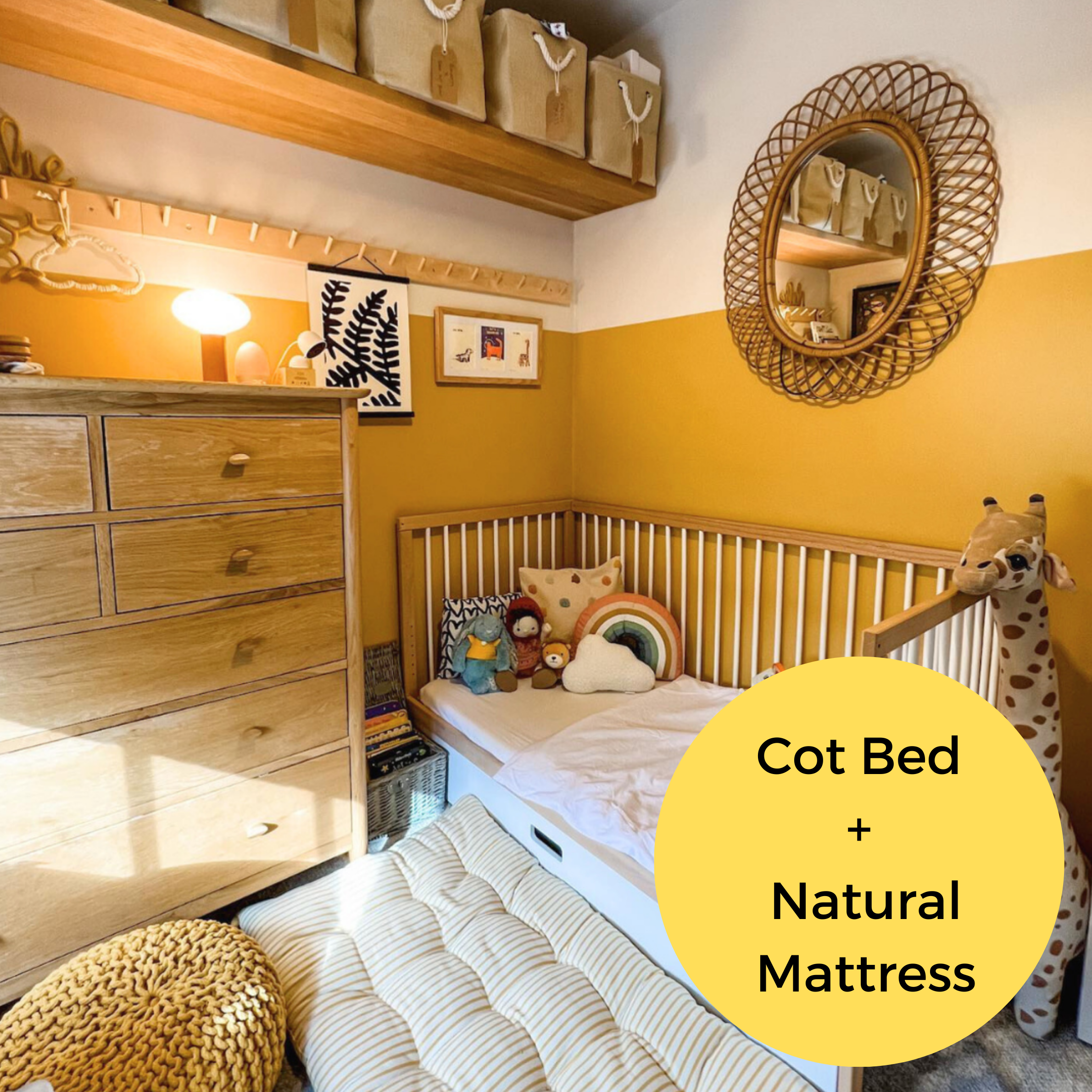 Our 100% natural cot bed bundle is perfect for the eco-conscious parent and well suited to any nursery style. Made with durable and sustainable materials, with absolutely no added toxic or harmful chemicals, you can have peace of mind that your baby is sleeping in the safest environment.