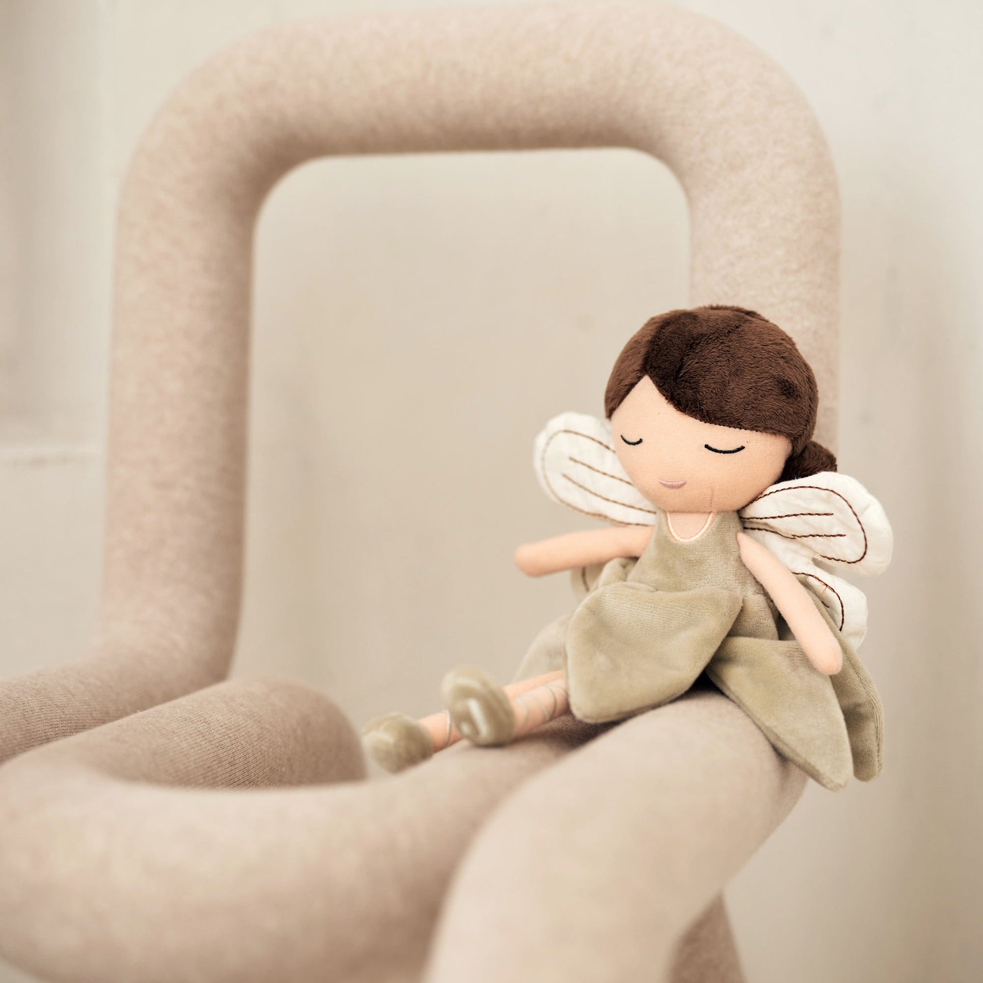 Meet Livia, the Jollein fairy doll who is here to bring comfort and a touch of magic to your little one's world. This sweet, 32-centimetre tall companion is designed for both enchanting play and peaceful cuddles. Dressed in a soft green dress with delicate wings, her gentle, calming presence is perfect for bedtime, where she'll watch over your child, or for daytime, where she encourages imaginative play and storytelling.