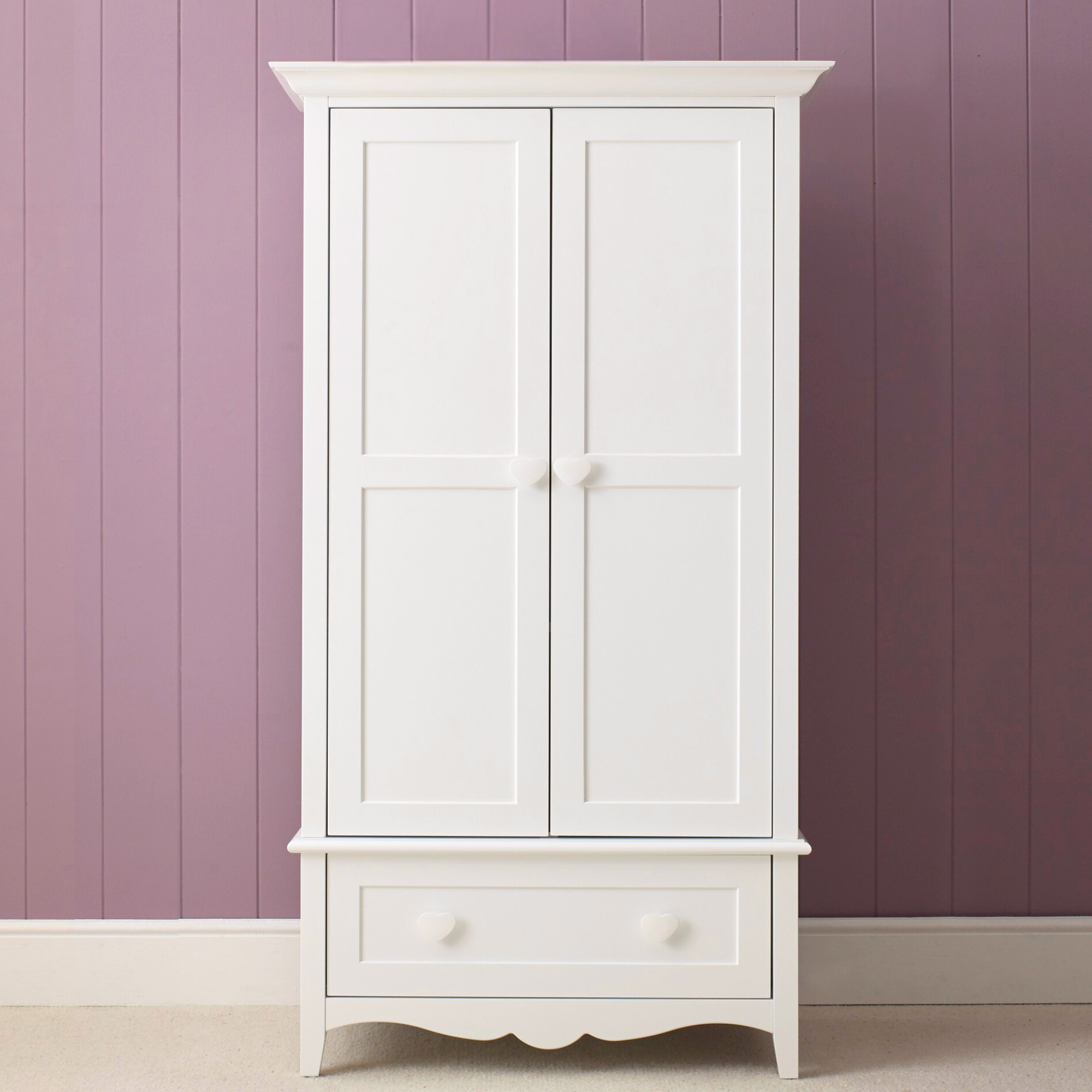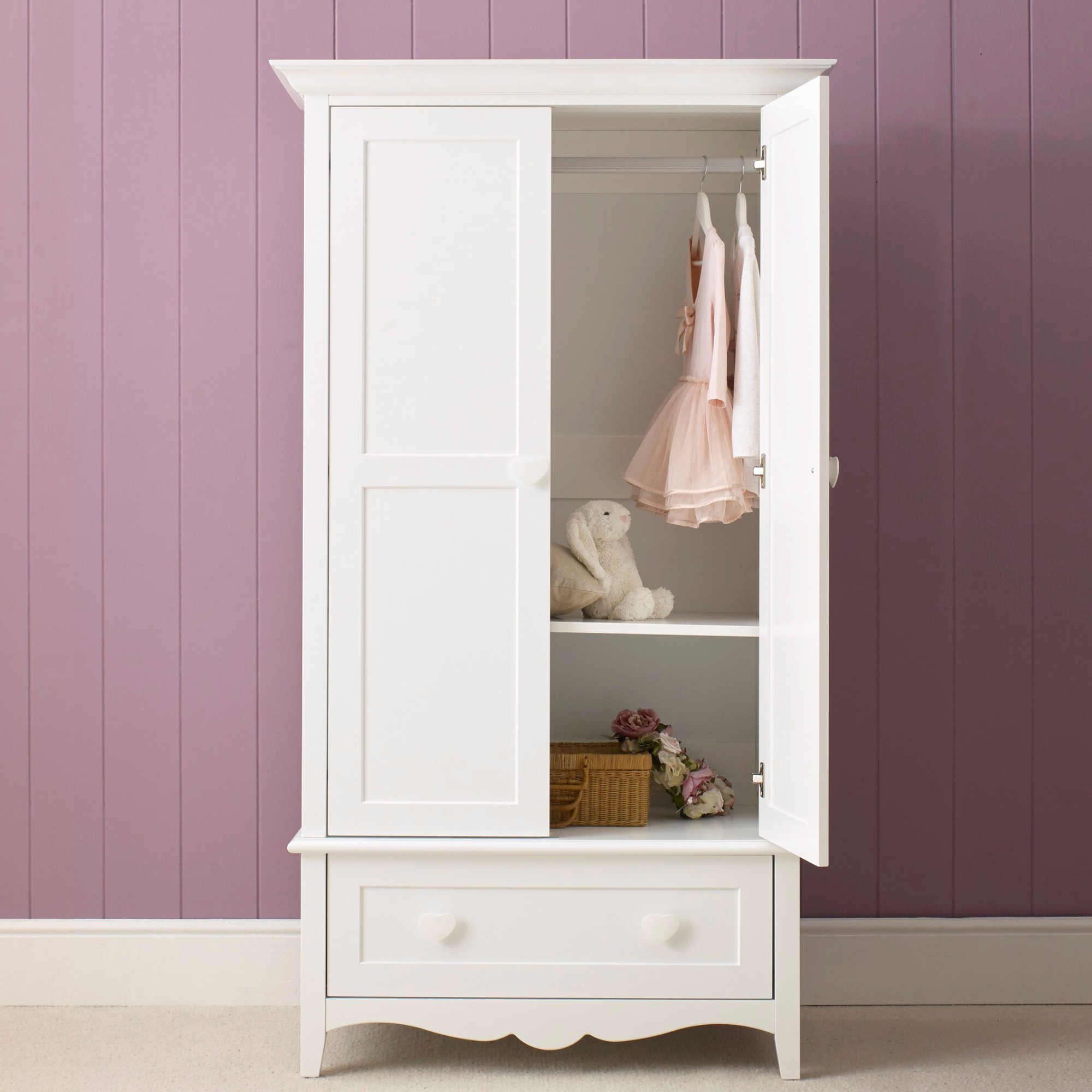 Designed for royal organisation, this wardrobe offers flexible storage for a growing collection. It features a spacious double-door section with an adjustable shelf and hanging rail, all resting upon a generous drawer unit for even more precious storage. To perfect the look, choose from delightful white, pink, or red handles.