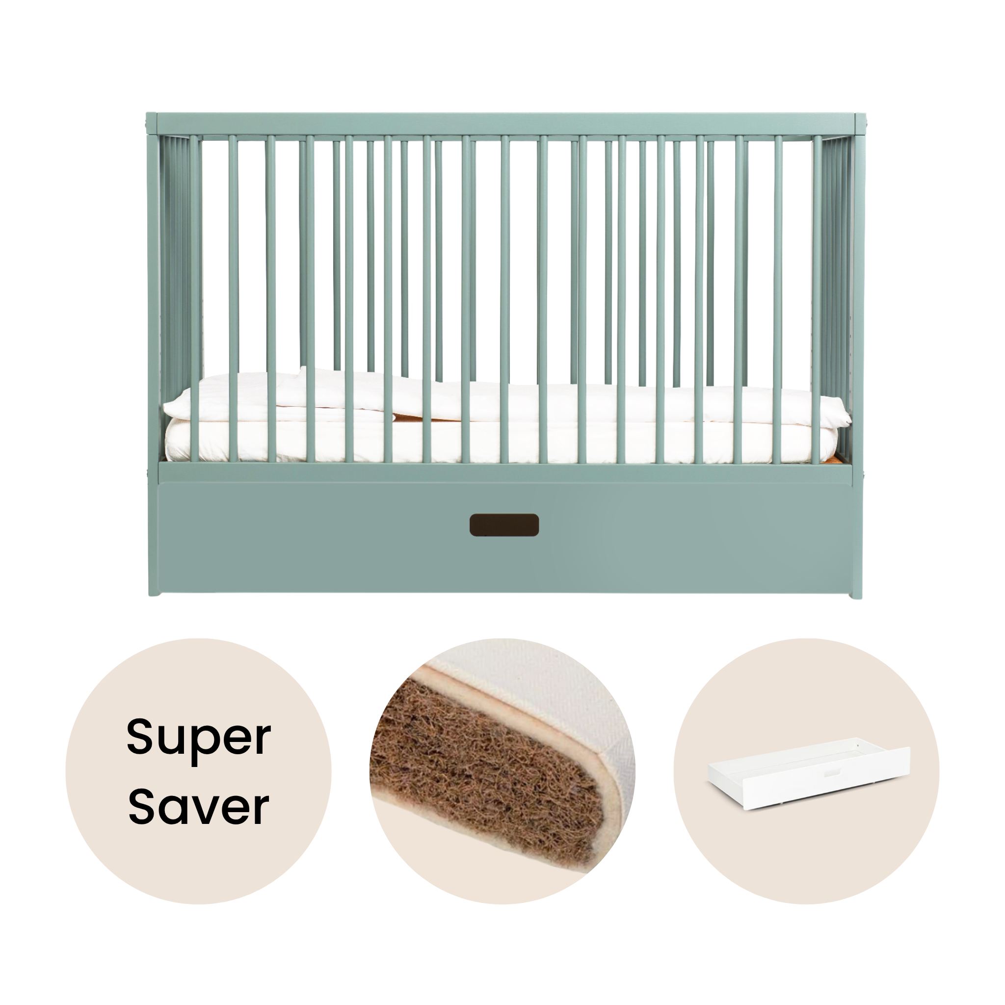 Mini Cot Bed With Drawer & Natural Mattress - Stone Teal