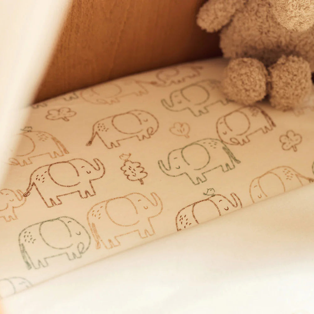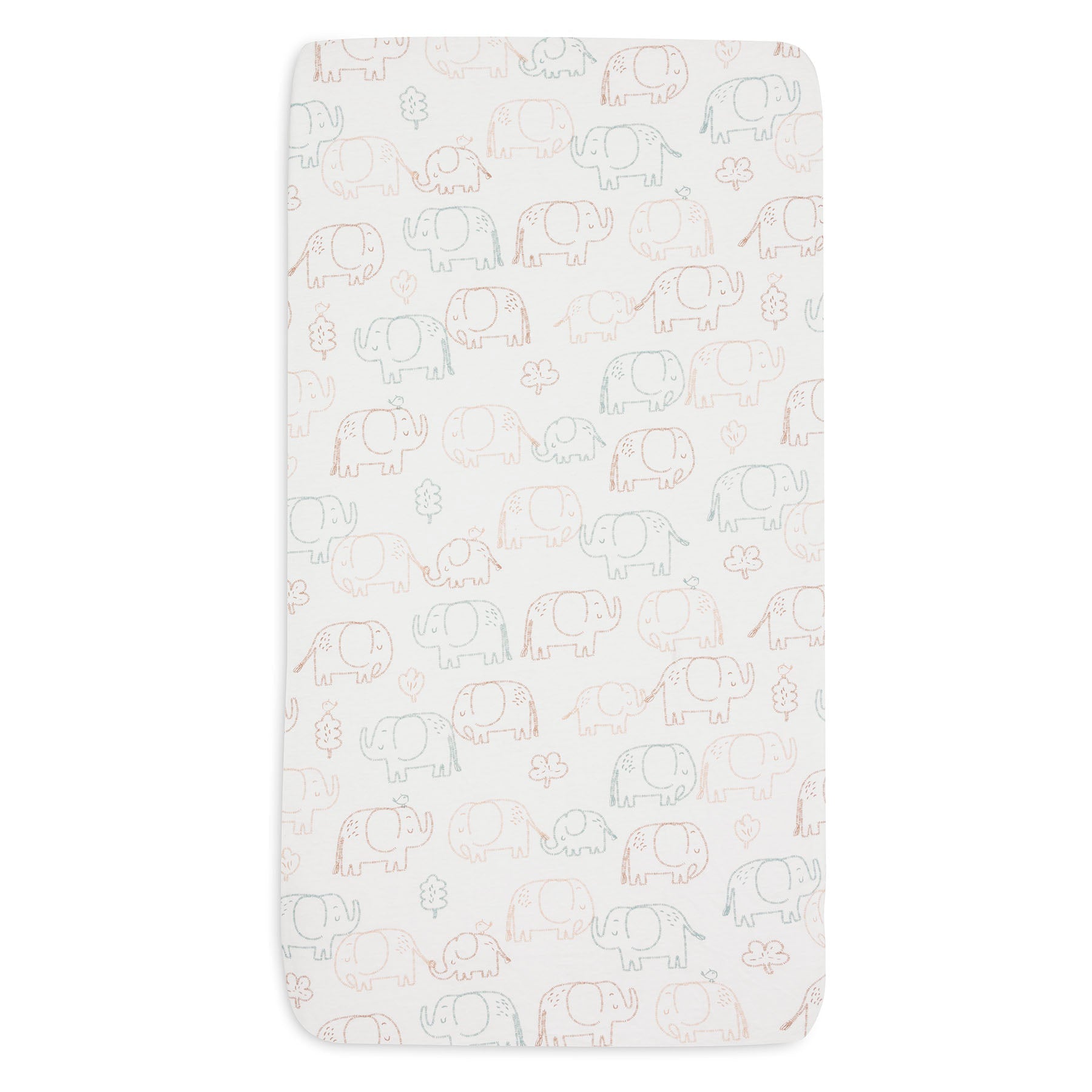It features a charming, unisex pattern of elephant outlines in a soft palette of muted tones on a white background, creating a calm and friendly atmosphere in the nursery. Practicality meets comfort with its elasticated edges, which ensure a snug, secure, and smooth fit on the mattress.