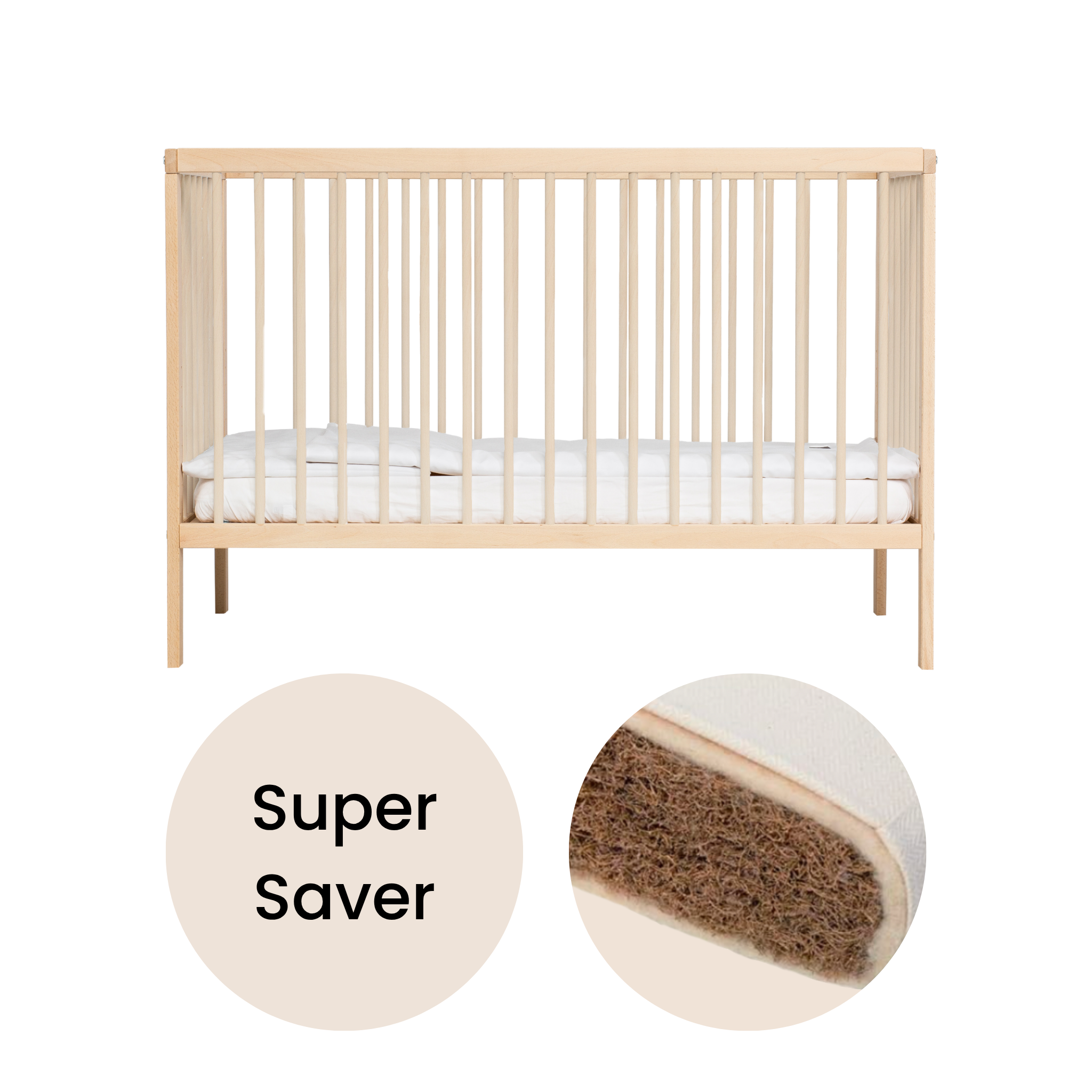 Our Premium natural cot bed bundle is perfect for the eco-conscious parent and well suited to any nursery style. Made with durable and sustainable materials, with absolutely no added toxic or harmful chemicals, you can have peace of mind that your baby is sleeping in the safest environment.