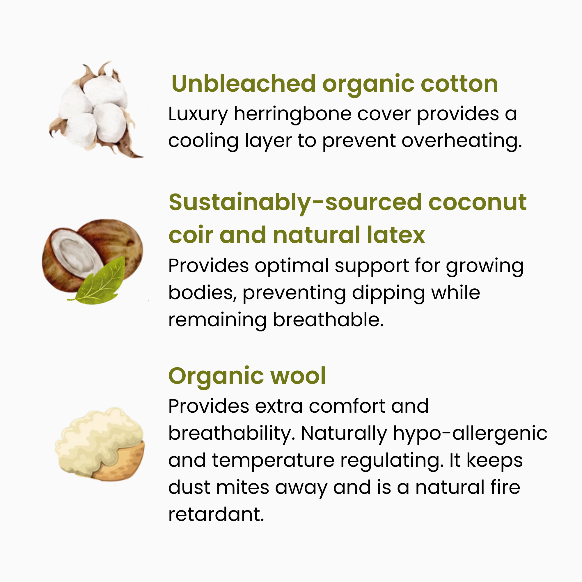 Composition: Organic cotton cover, natural wool, organic coconut coir and natural latex